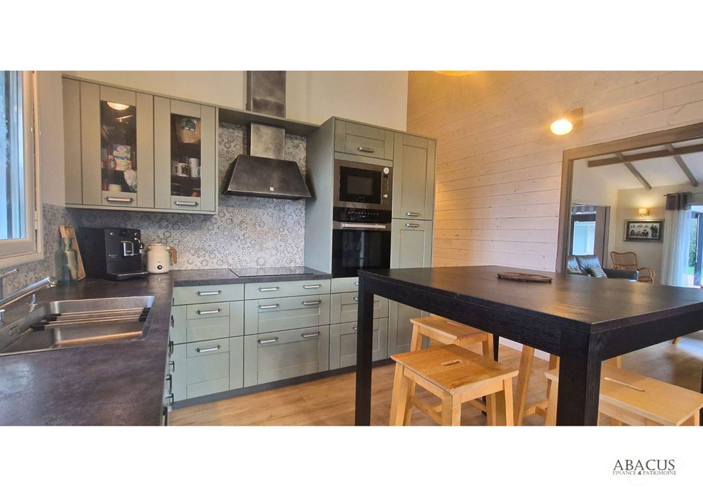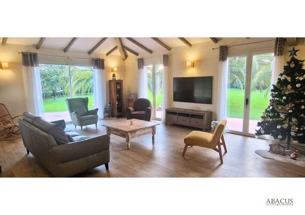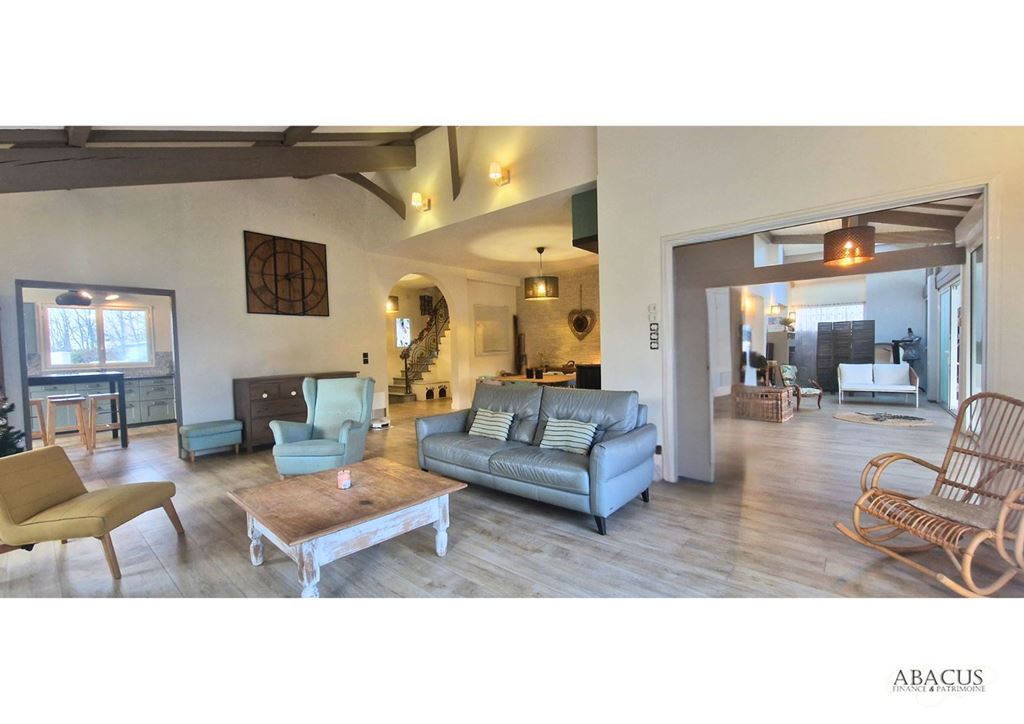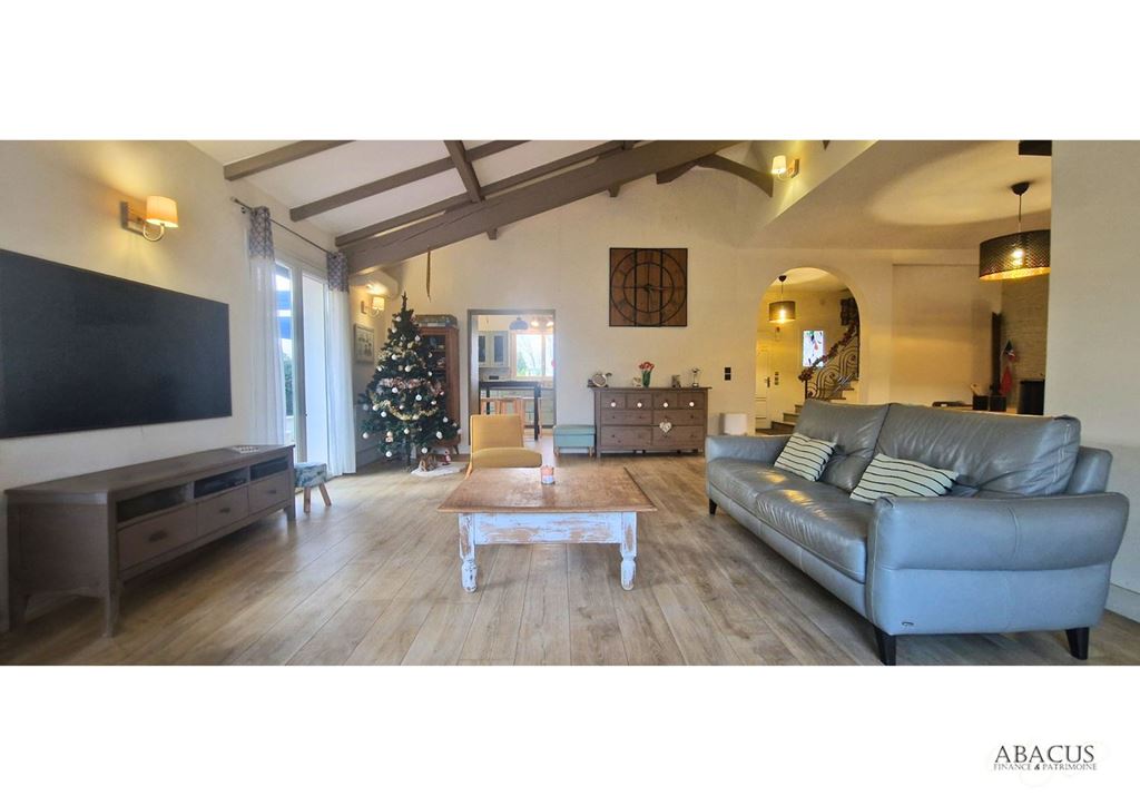 Implantée sur un terrain plat et arboré, cette propriété en parfait état séduit par ses volumes généreux et ses prestations modernes : panneaux solaires pour une auto-consommation optimale, grand séjour double avec cheminée, cuisine semi-ouverte prolongée par une terrasse, arrière-cuisine, buanderie, bureau ou chambre, et suite parentale avec dressing et salle d'eau.