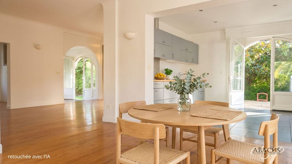 Anglet — Quartier résidentiel préservé. Villa de plain-pied, 154 m² habitables, terrain 1 257 m². Implantée dans l'une des adresses les plus discrètes d'Anglet, cette propriété bénéficie d'une situation rare : calme absolu, accès privatif, vis-à-vis inexistant. Le bâti, construit en 1977 et rénové en 2013, présente une architecture soignée aux détails caractéristiques — arches, parquet ancien massif, cheminée de caractère — qui lui confèrent une identité propre, loin des productions standardisées. Les espaces de vie, concentrés sur 90 m² en plateau ouvert, offrent une polyvalence d'usage rare : le plan permet une organisation conviviale pour recevoir comme une organisation intime pour habiter. La cuisine traversante, ouverte sur terrasse et piscine, est un atout rarement rencontré à ce niveau de marché. La partie nuit — quatre chambres, deux salles d'eau, dressing — est organisée autour d'un couloir dédié, garantissant une séparation nette des espaces jour et nuit. Le garage indépendant complète l'ensemble. Extérieur : piscine 5×3, terrasse bois, terrain paysagé de 1 257 m². Environnement immédiat protégé. Réseaux de distribution intégralement refaits en juin 2025. Disponible immédiatement.