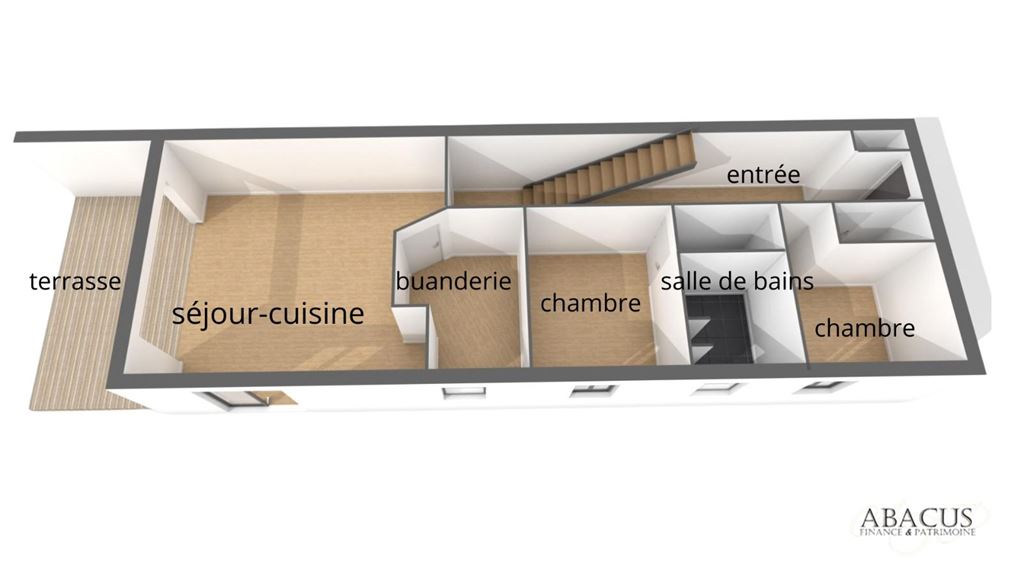 Elle est composée : d´une entrée, pièce de vie avec un salon - salle a` manger avec poêle à granules donnant accès sur la terrasse, une cuisine équipée open space, deux chambres, une salle de bains avec une douche complémentaire, un wc indépendant
