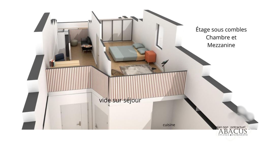 A l'étage une chambre et une mezzanine bureau donnant sur la pièce de vie.