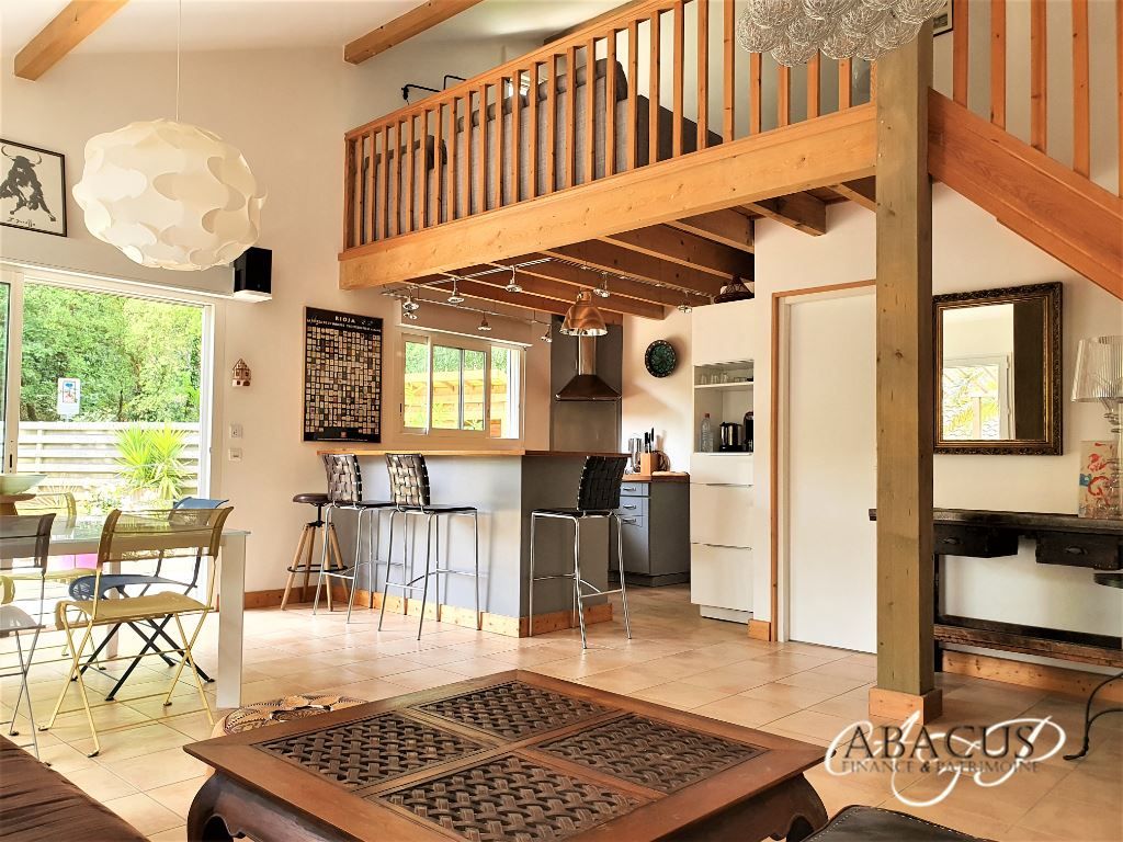 Entrée sur séjour cathédral, cuisine ouverte équipée, buanderie, salle d'eau avec wc, une chambre en rez de chaussée.